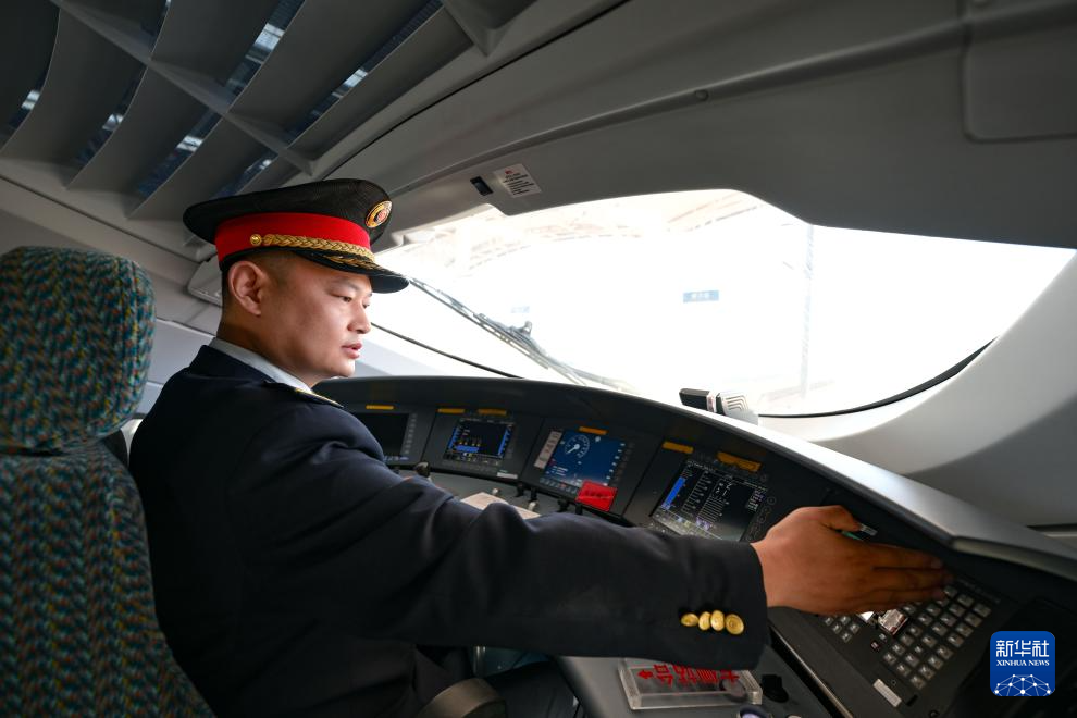 10月1日,由银川开往惠农的C8218次列车上,动车组司机在进行发车前的准备工作。