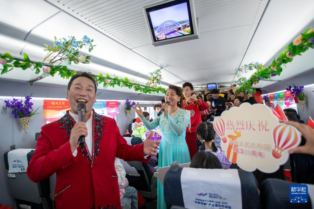 10月1日,在由银川开往惠农的C8218次首发列车上,艺术家演唱当地特色歌曲《花儿》。