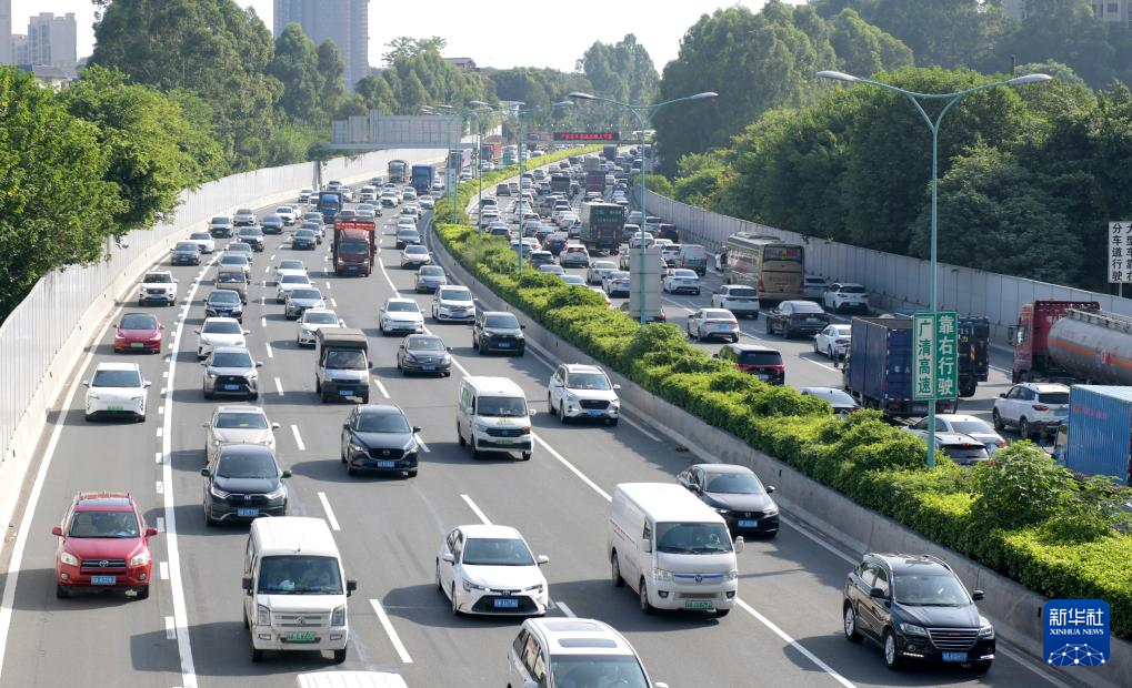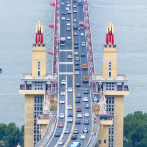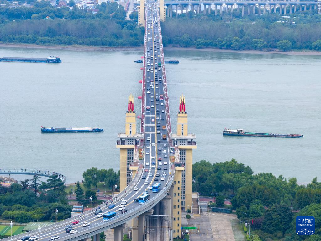 这是10月1日拍摄的南京长江大桥上的车流(无人机照片)。