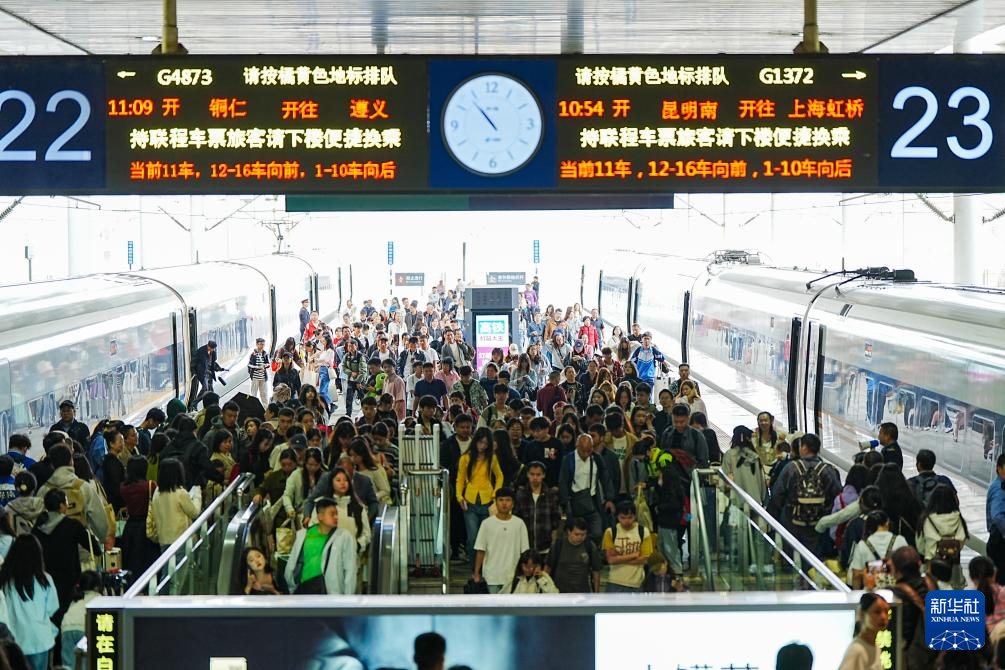 10月1日,旅客在贵阳北站候车大厅准备乘车出行。