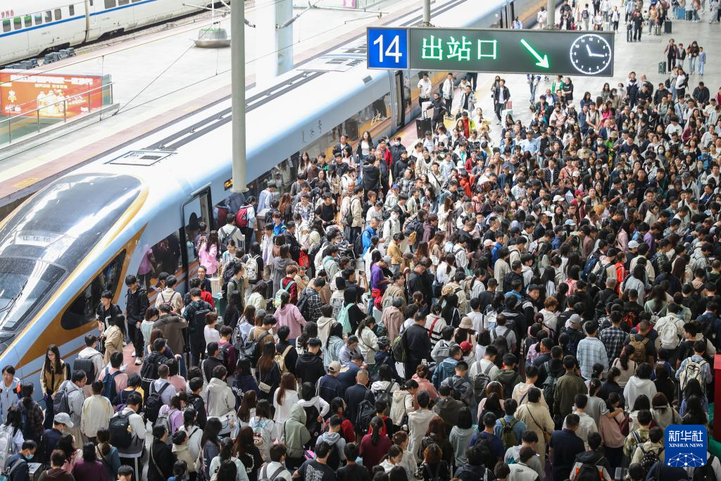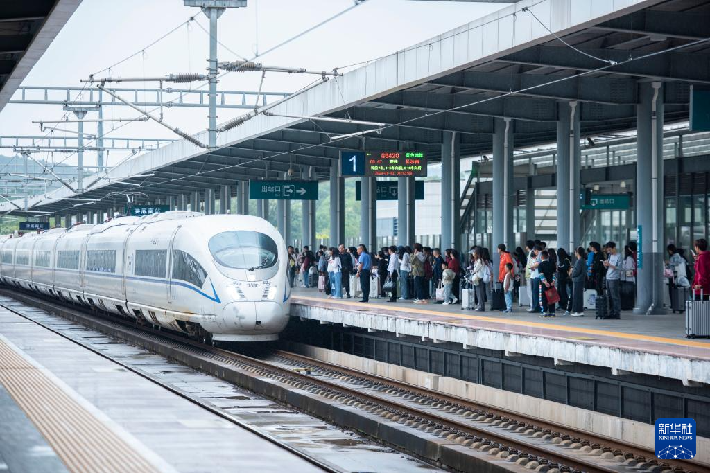 10月1日,旅客在湖南娄底南站站台准备乘车。