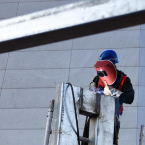 10月3日,在山东省滕州市三维重工有限公司,工人在测量钢构件。
