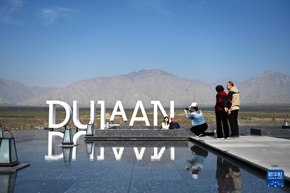 10月4日,游客在图兰朵葡萄酒小镇欣赏贺兰山景色。