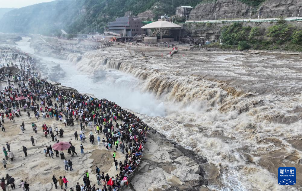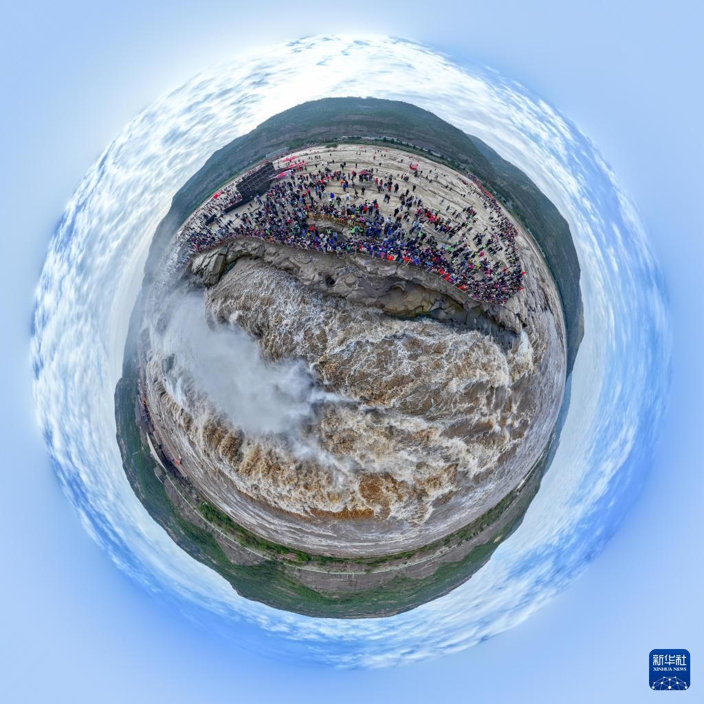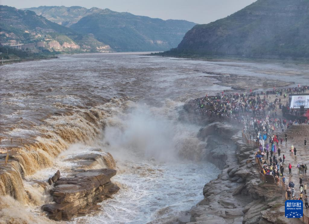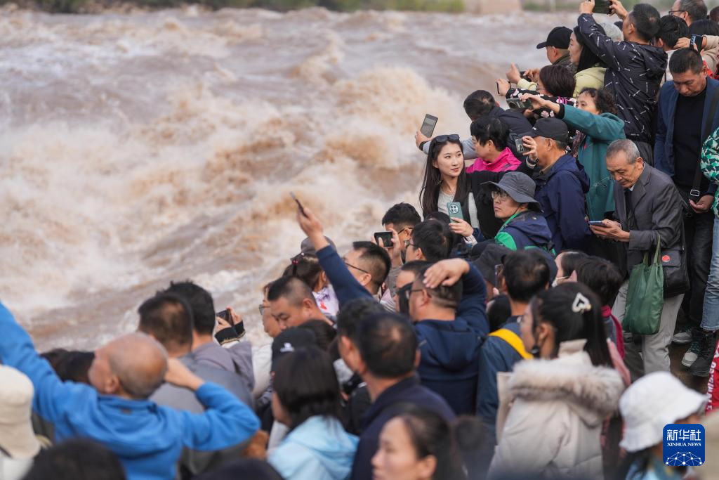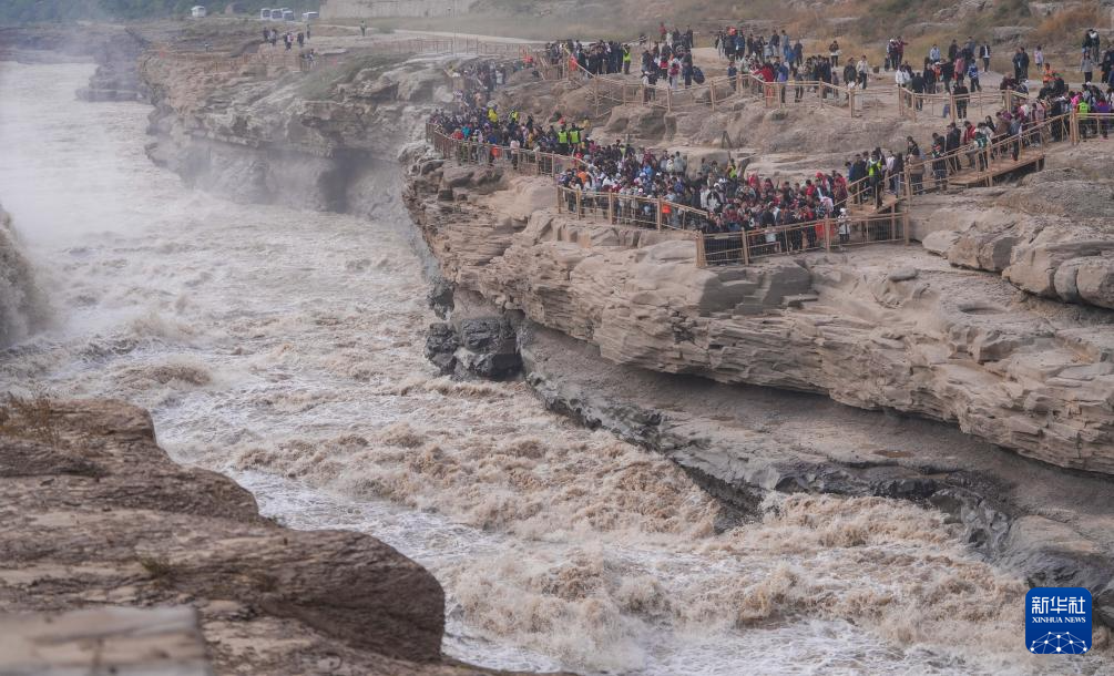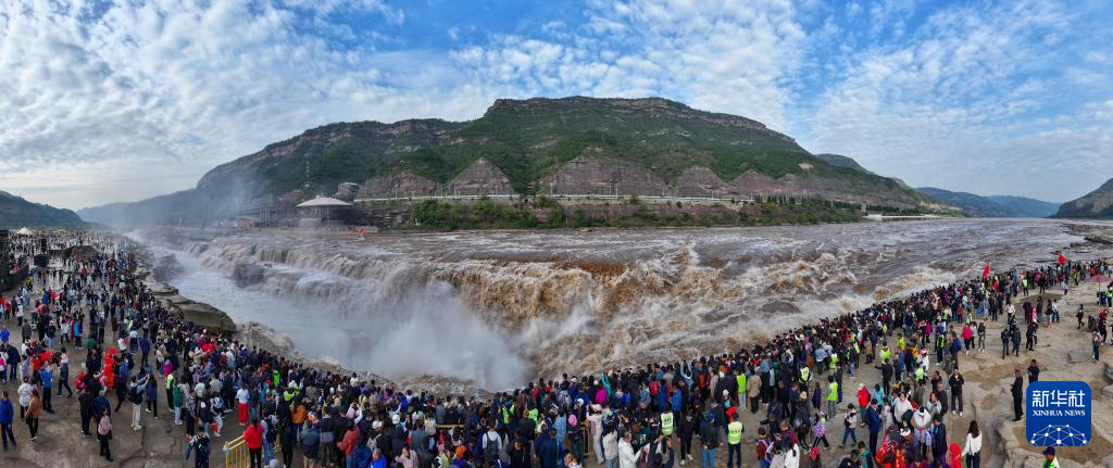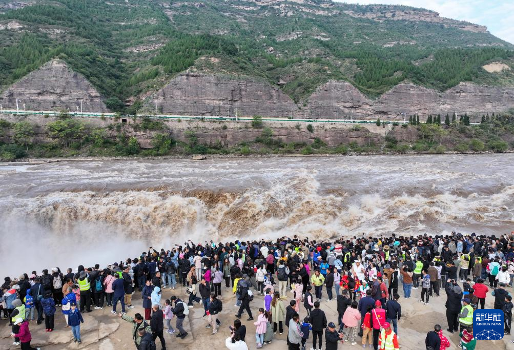 国庆长假期间,位于山西省吉县和陕西省宜川县交界处的黄河壶口瀑布迎来众多游客,观赏“黄河之水天上来”的壮观景象。