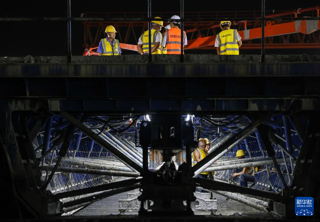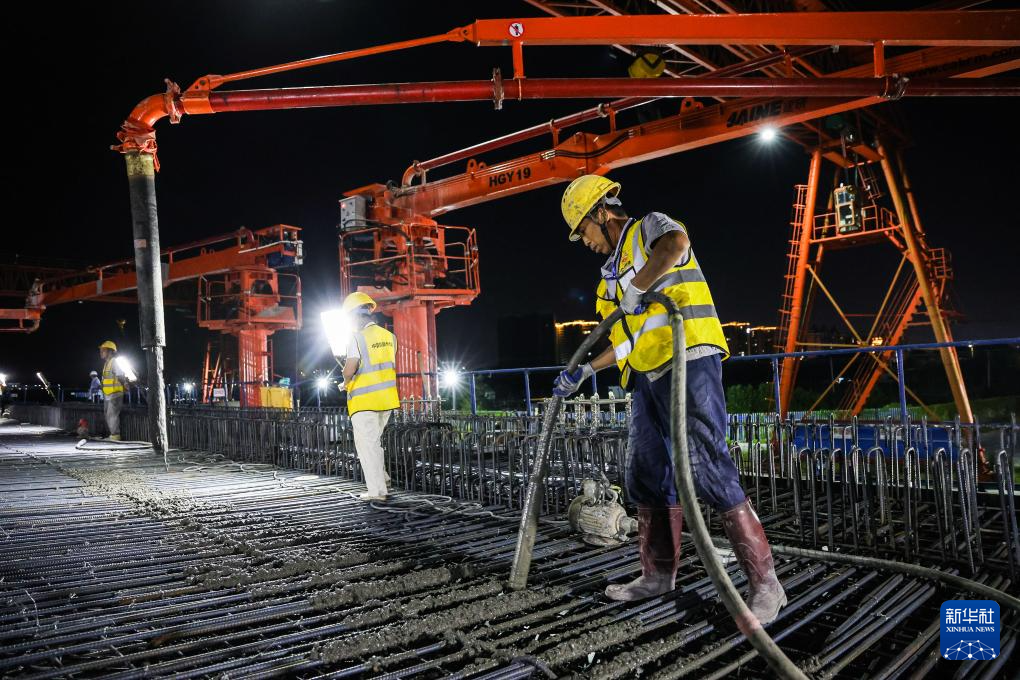 10月3日夜,施工人员在中铁建大桥局中山制梁场为预制箱梁浇筑混凝土。