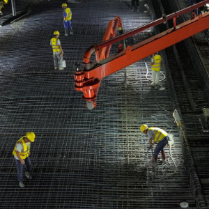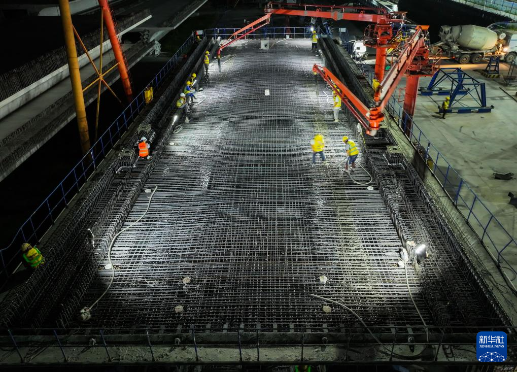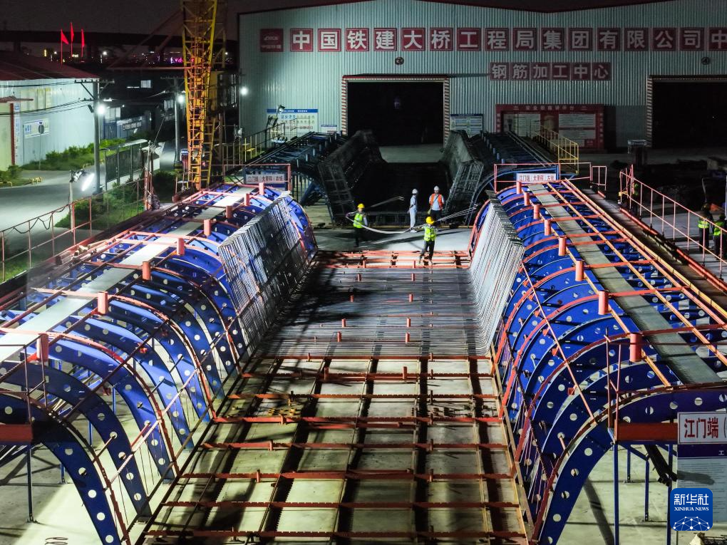 10月3日夜,施工人员在中铁建大桥局中山制梁场往预制箱梁模具里摆放钢筋(无人机照片)。