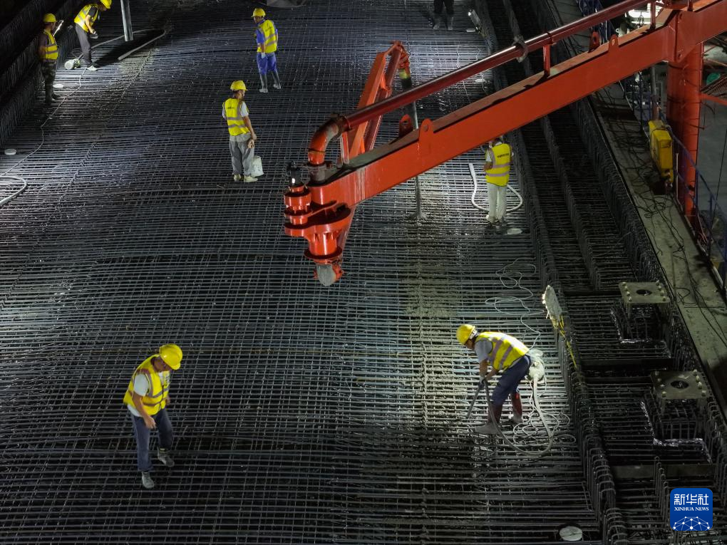 10月3日夜,施工人员在中铁建大桥局中山制梁场为预制箱梁浇筑混凝土(无人机照片)。
