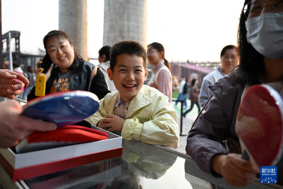 10月4日,小游客在首钢园大满贯公园选购球拍。 新华社记者 宋彦桦 摄pagebreak