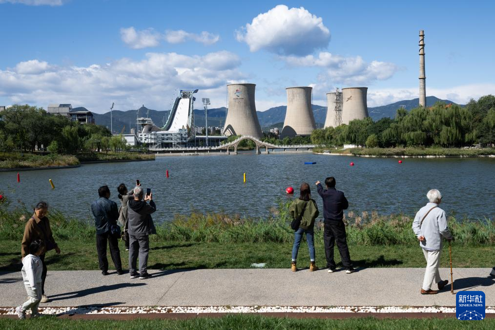 10月1日,人们在首钢园群明湖畔游览,远处是北京冬奥会滑雪大跳台。 新华社记者 肖艺九 摄pagebreak