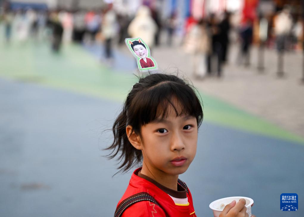 10月4日,小游客头戴印有运动员马龙照片的头饰在首钢园大满贯公园游览。 新华社记者 宋彦桦 摄pagebreak