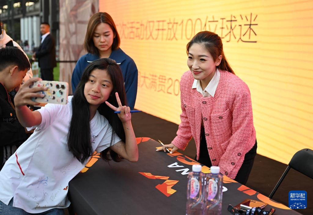 10月4日,乒乓球奥运冠军刘诗雯(右)在球员见面会上与球迷合影。 新华社记者 宋彦桦 摄pagebreak