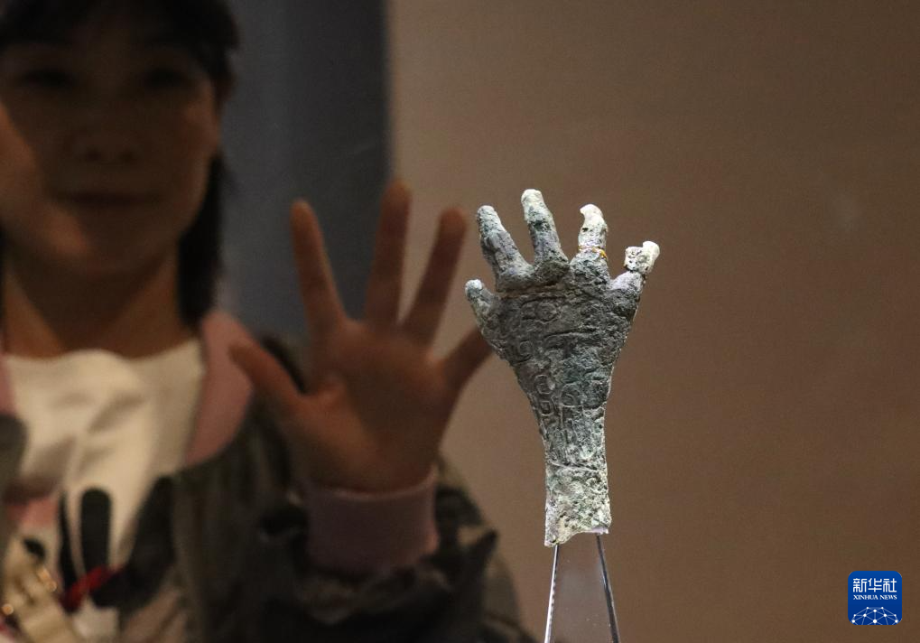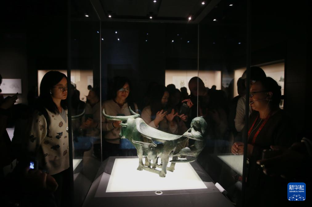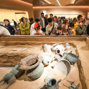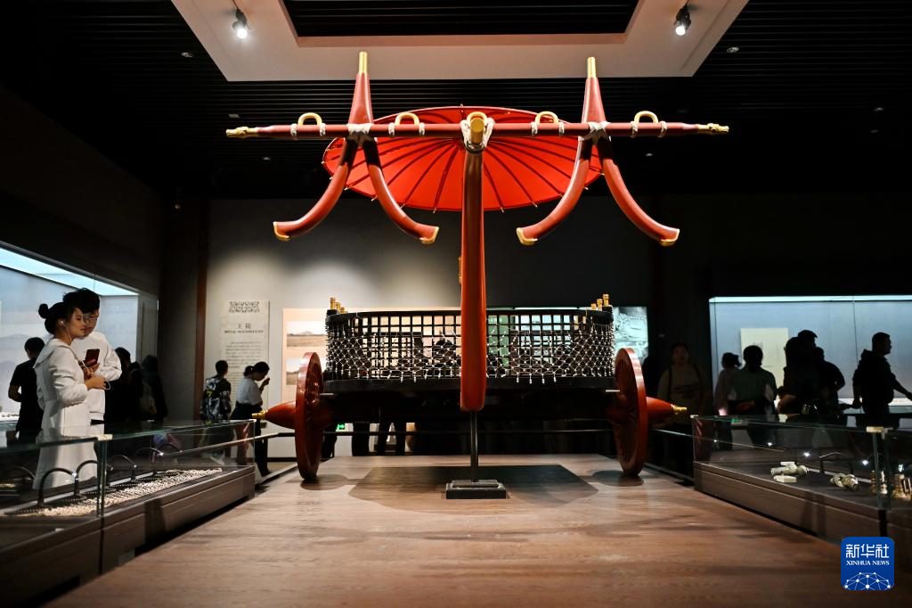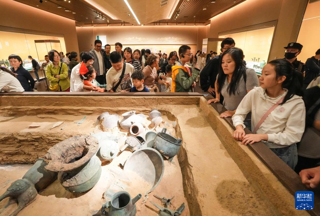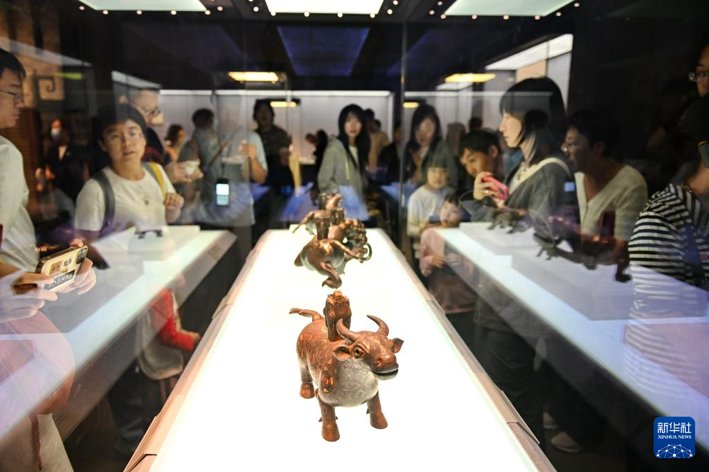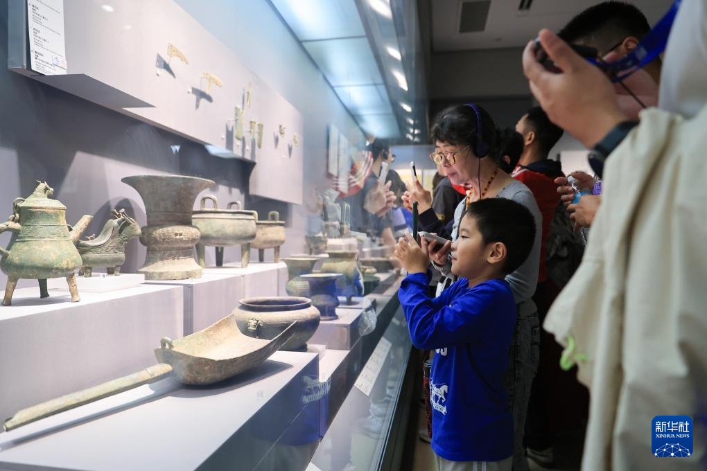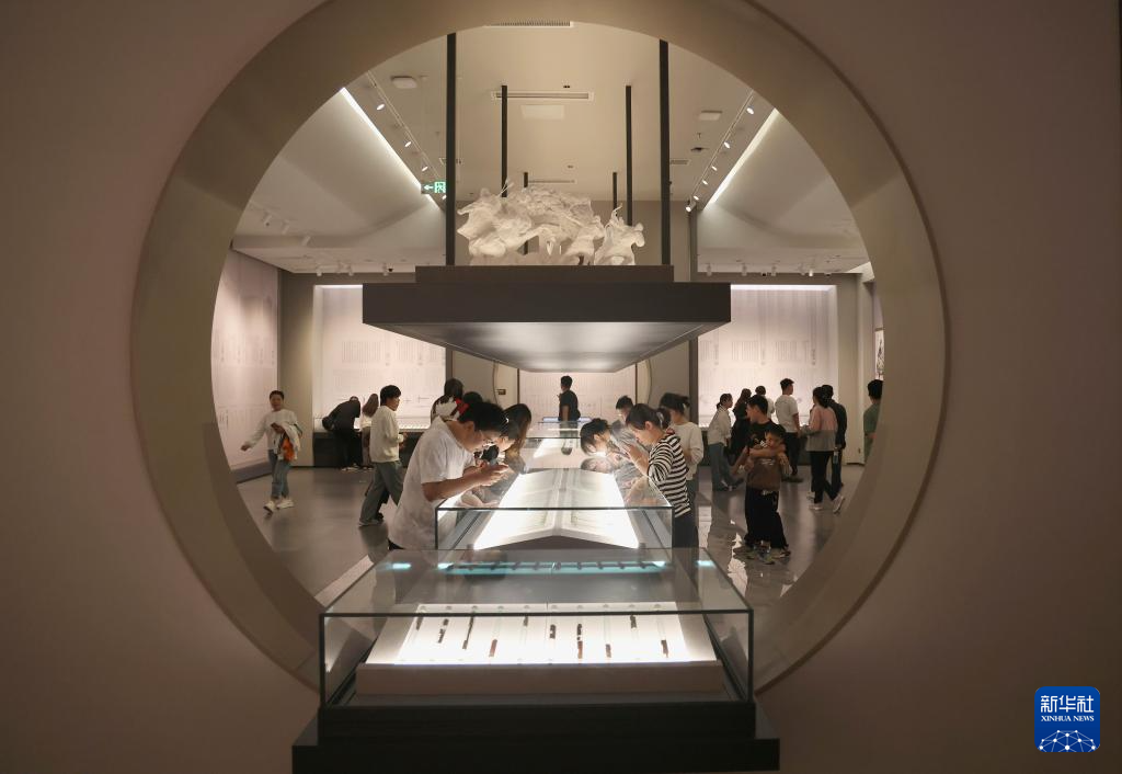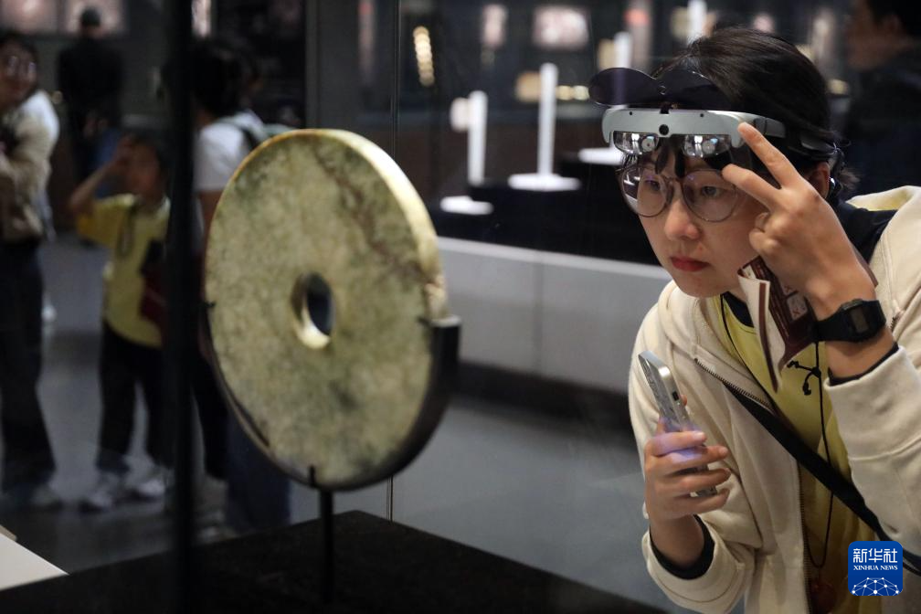 10月5日,在浙江省杭州市余杭区的良渚博物院,游人在观赏展品。