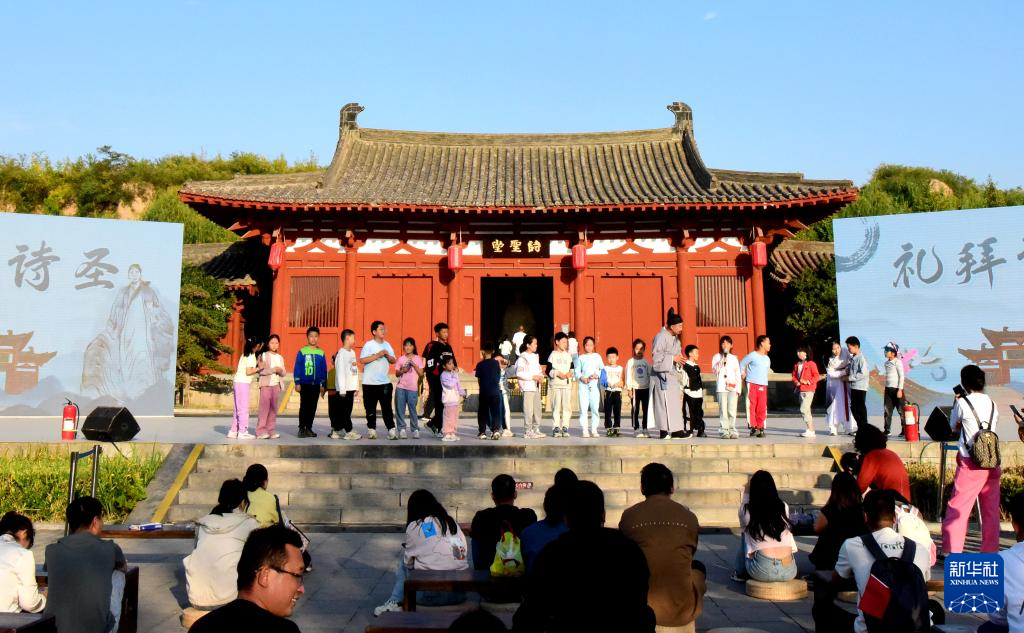 10月4日,游客在河南省巩义市杜甫故里景区参加“礼拜诗圣”互动活动。