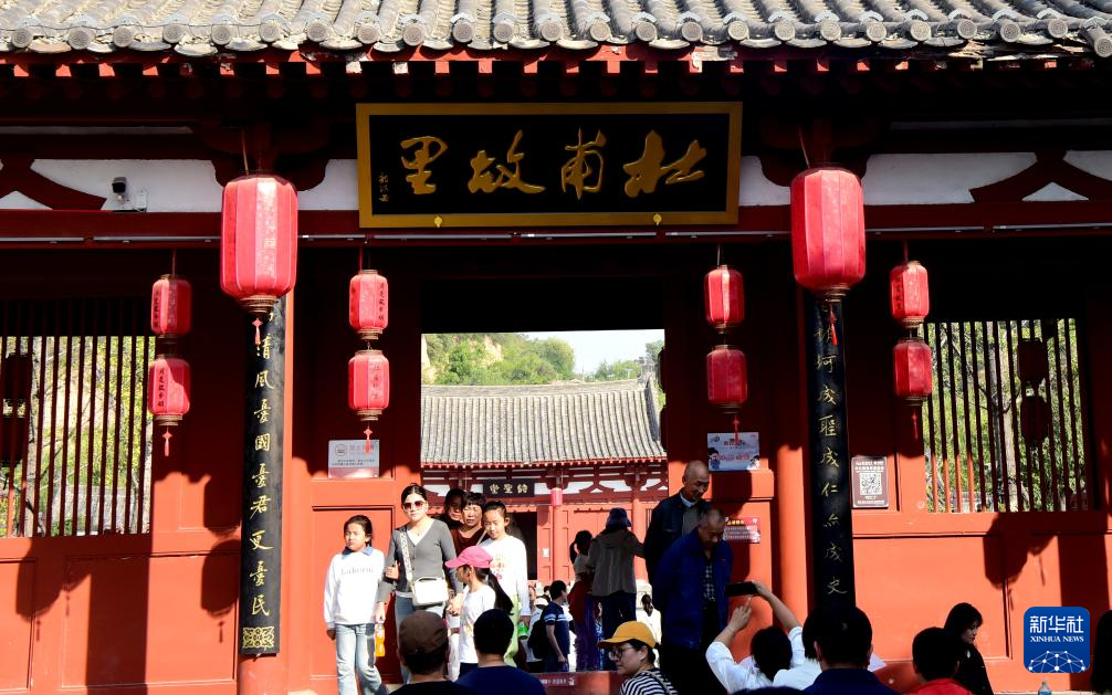 10月4日,游客在河南省巩义市杜甫故里景区参观。