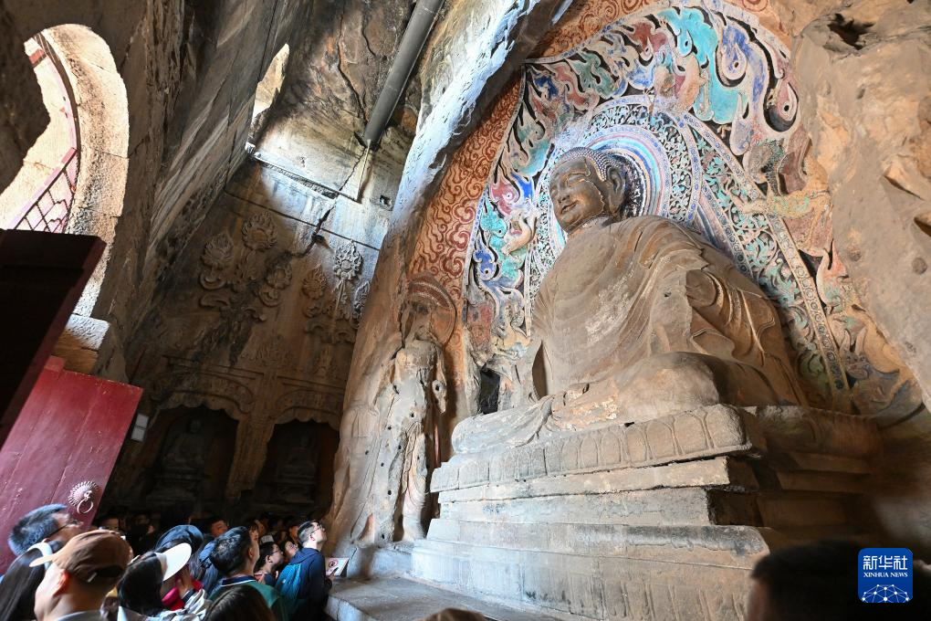 10月2日,游客在位于河北省邯郸市峰峰矿区的响堂山石窟景区参观游览。