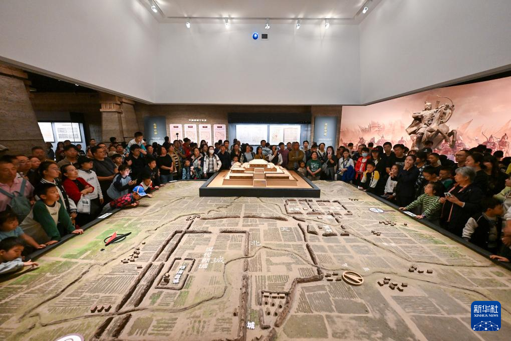 10月5日,游客在河北省邯郸市博物馆观看赵都邯郸王城复原沙盘。