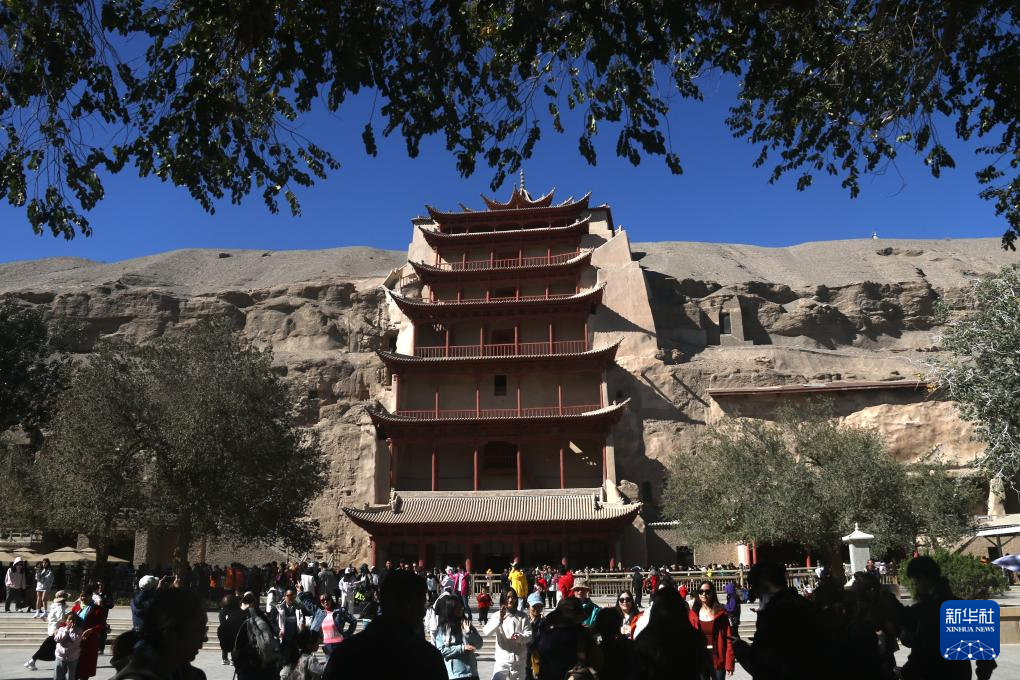 10月2日,游客在甘肃敦煌莫高窟游览。