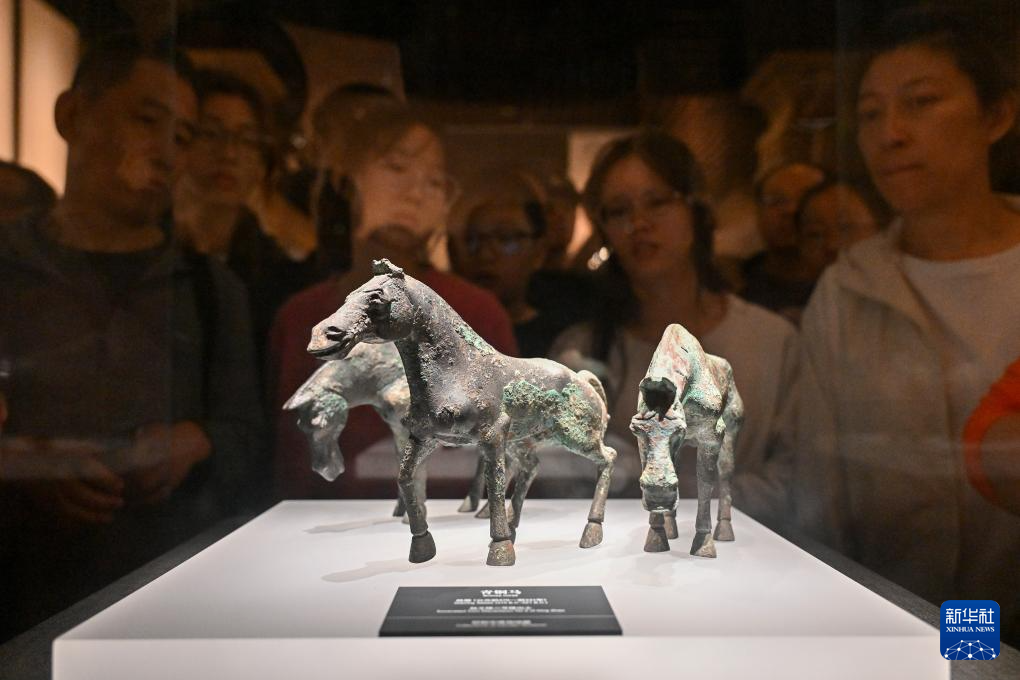 10月5日,游客在河北省邯郸市博物馆观看赵王陵二号陵出土的战国时期的青铜马。
