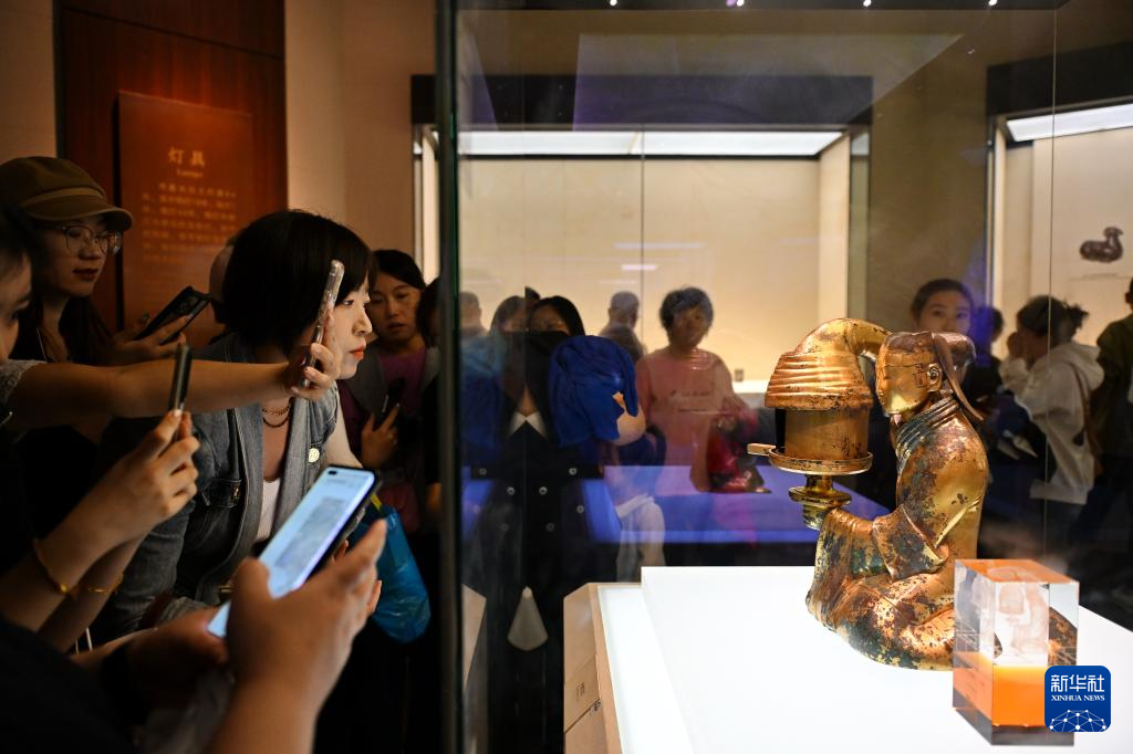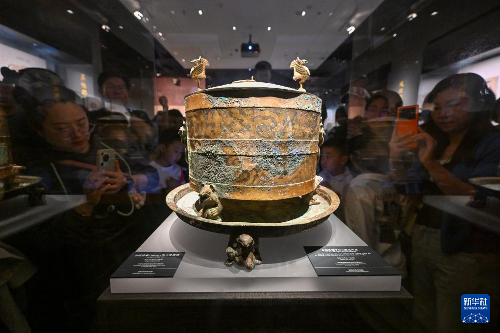 10月5日,游客在河北省邯郸市博物馆观看馆藏的金银涂乘舆大爵酒樽和金银涂宽平沿三熊足承盘。