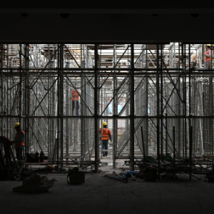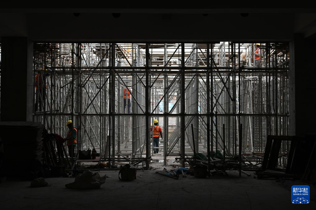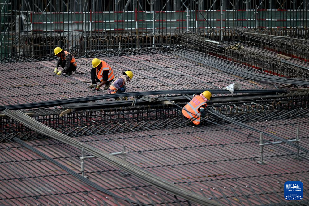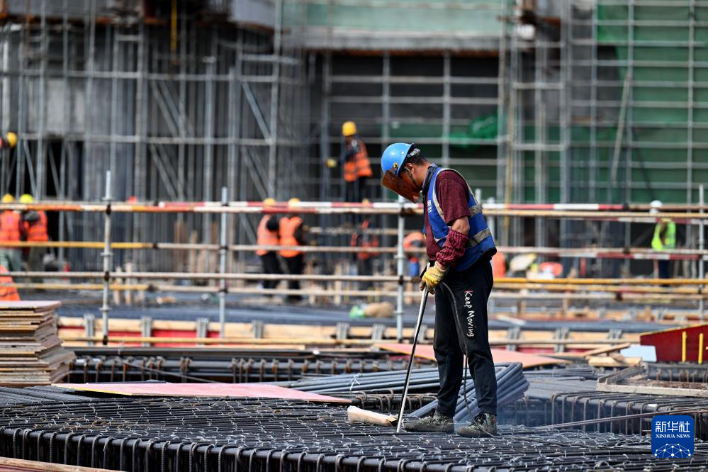 10月5日,中建三局的工作人员在合肥新桥国际机场综合交通中心项目工地施工。