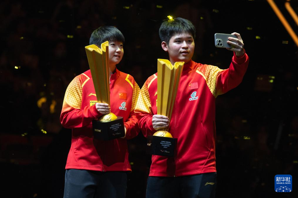 10月6日,男单冠军林诗栋(右)与女单冠军孙颖莎在颁奖仪式上自拍。