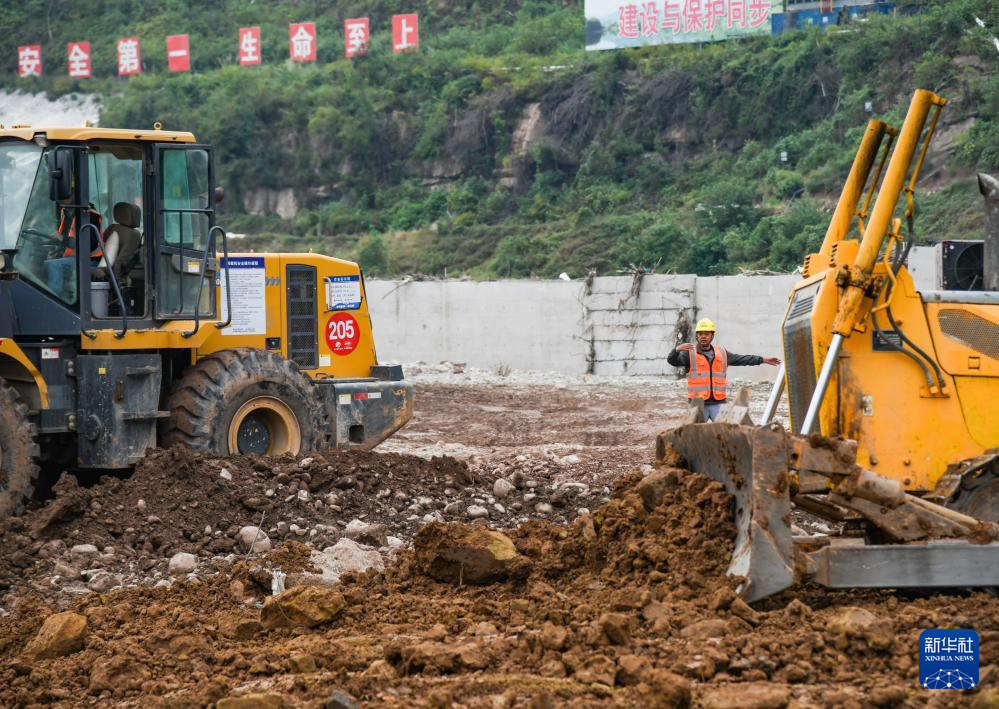 10月6日,在四川省巴中市通江县境内的青峪口水库建设现场,工人在指挥工程车辆施工作业。