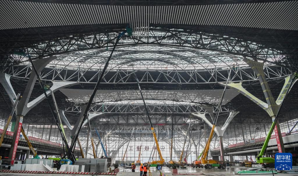 国庆假期,由中铁建设、中铁建工等单位承建的重庆东站站房及配套综合交通枢纽工程加紧建设。工人们坚守岗位,抢抓施工进度。