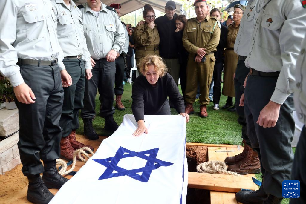 2024年1月23日,在以色列特拉维夫的一处公墓,家人送别一名以色列士兵。以色列国防军发言人当天称,21名以军预备役士兵22日在加沙地带中部的一次战斗中身亡。