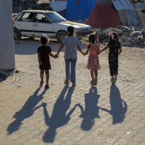 2024年8月20日,在加沙地带南部城市汗尤尼斯,孩子们站在一处废墟旁。