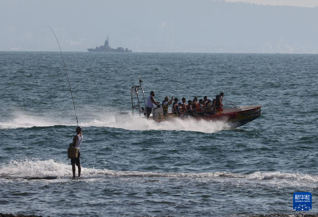 2024年8月25日,在以色列北部城市阿卡,以色列军舰在海岸附近游弋。