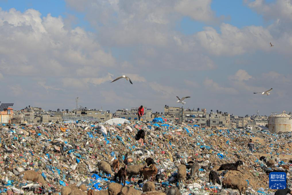 2024年2月9日,在加沙地带南部城市拉法,人们在堆满垃圾的地方放羊。