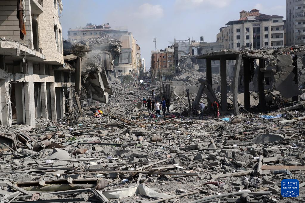2023年10月10日,人们在加沙地带的加沙城查看被以色列空袭炸毁的建筑废墟。