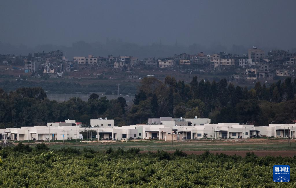 这是2024年1月11日在加沙边境以色列一侧拍摄的以色列建筑(前)和加沙北部遭袭情况(后)。