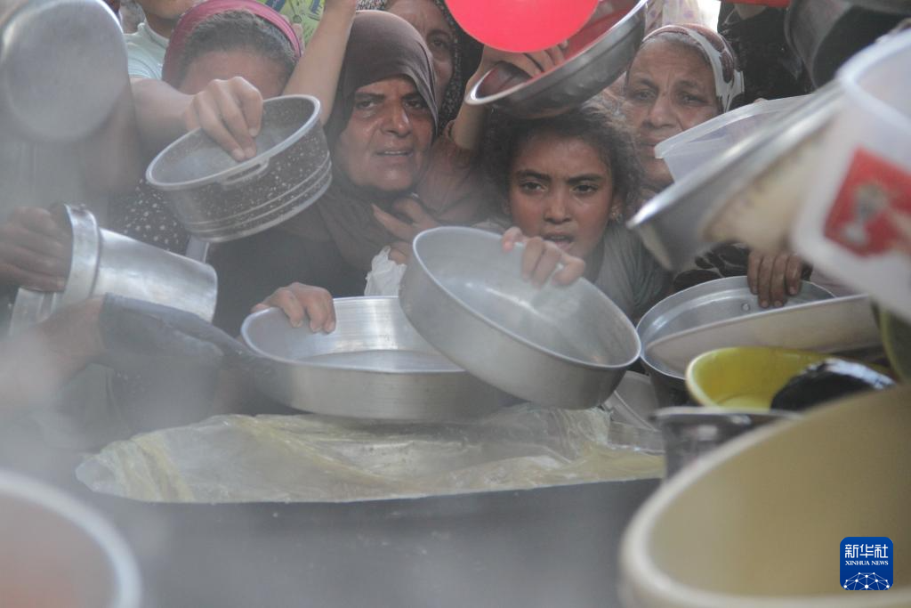 2024年8月29日,在加沙地带北部杰巴利耶难民营,当地民众领取救济食物。
