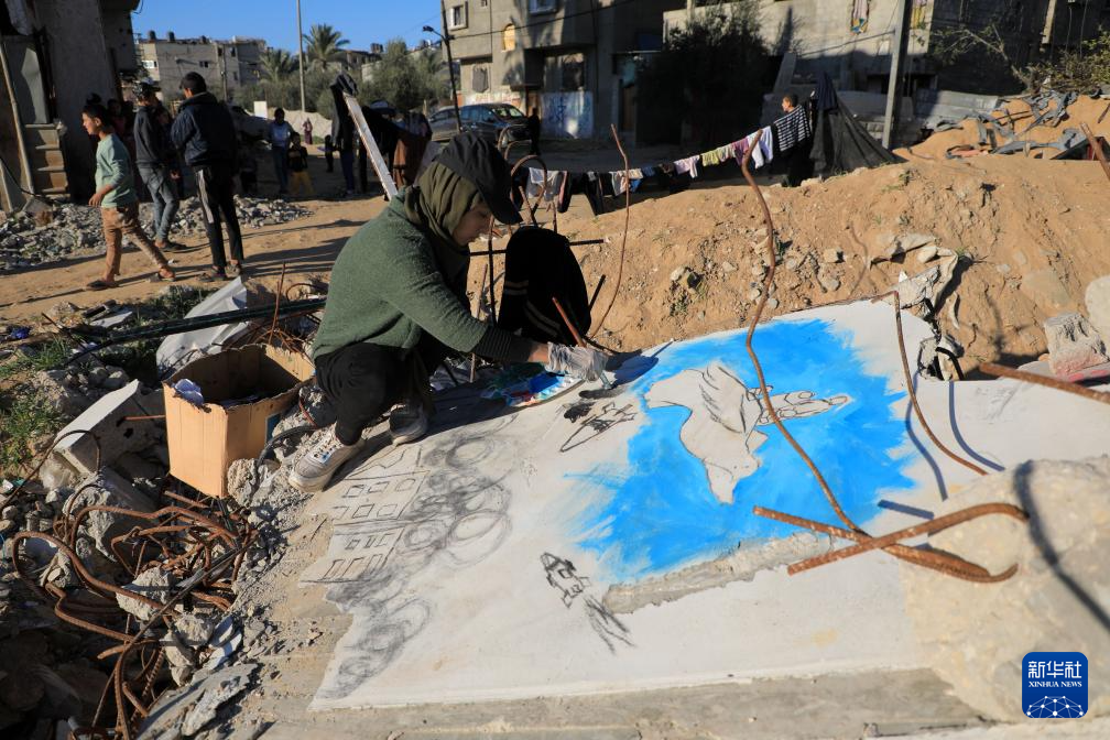 2024年1月5日,在加沙地带南部城市拉法,巴勒斯坦画家阿迈勒·阿布·萨巴赫在废墟上绘画,希望以此来记录加沙人民的苦难经历,让人们不要忘记这段历史。
