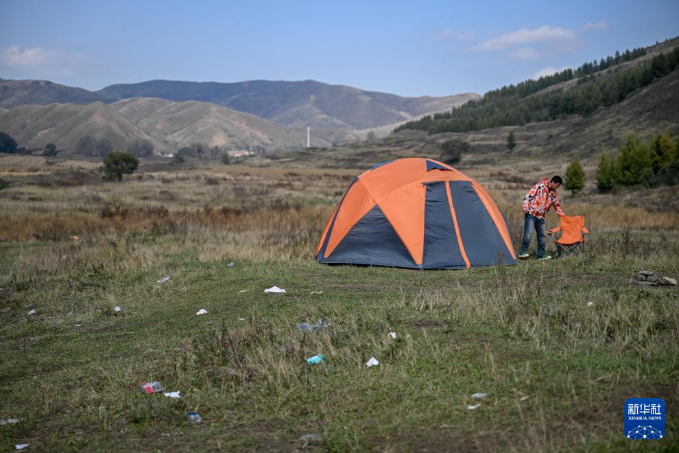 内蒙古呼和浩特附近一处自然保护区,垃圾散落在露营者的帐篷边上(10月4日摄)。