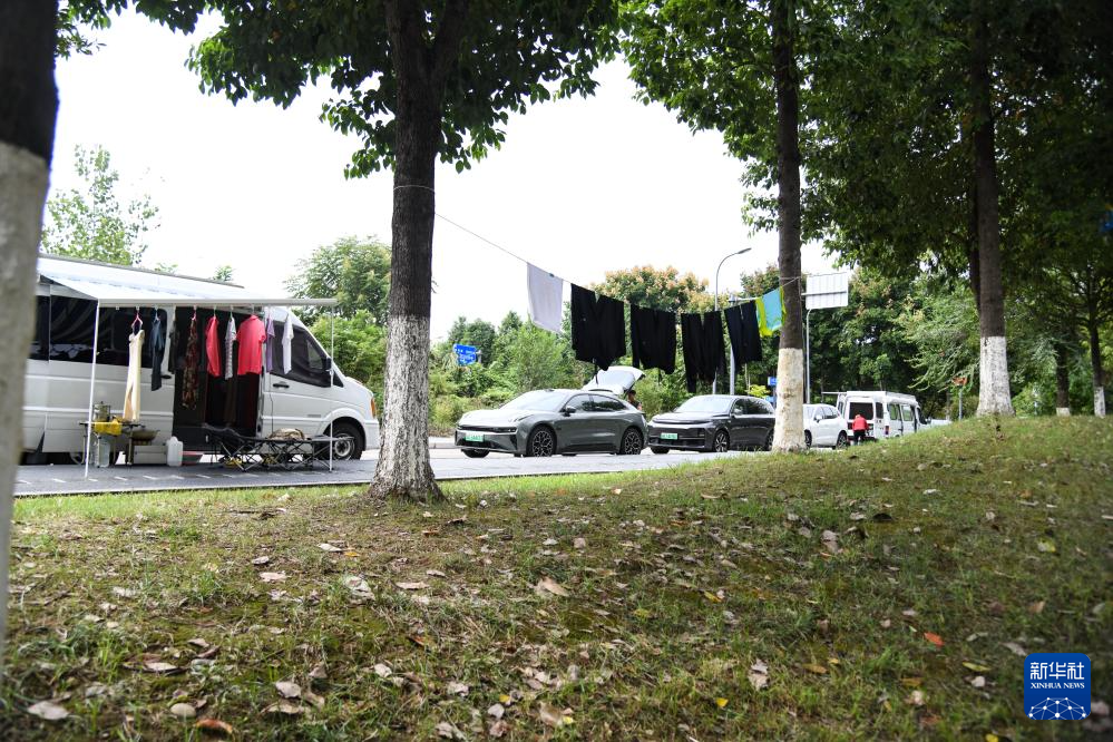 在四川成都新川之心公园,露营者将衣服晾在人行道边(10月1日摄)。