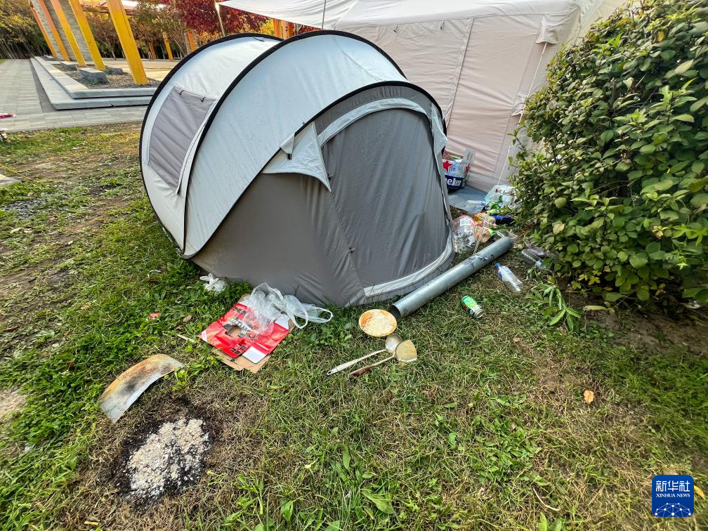 在吉林省长春市伊通河中段滨水绿道工业轨迹公园免费露营地,帐篷外散落着露营者野炊后留下的用品和垃圾,草坪还有被烧毁的痕迹(10月1日摄)。