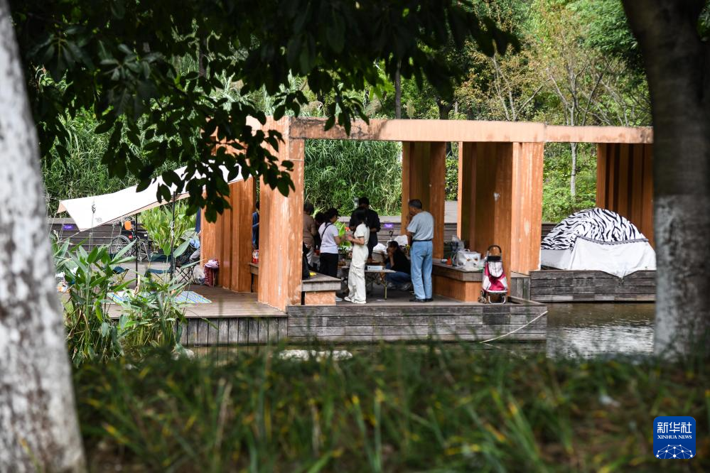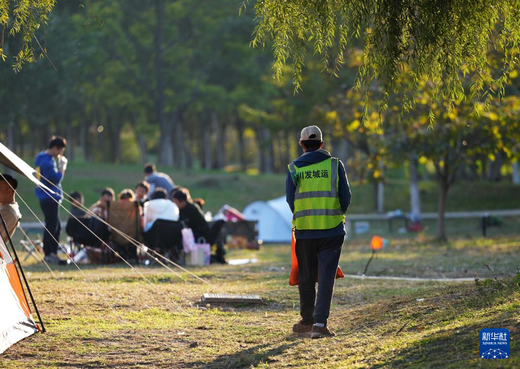 在四川成都新川之心公园,游客在属于公共休息的区域露营(10月1日摄)。