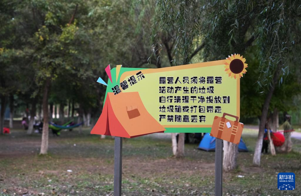 在辽宁沈阳一处露营地,树立着提醒露营者自行清理垃圾的提示牌(10月4日摄)。