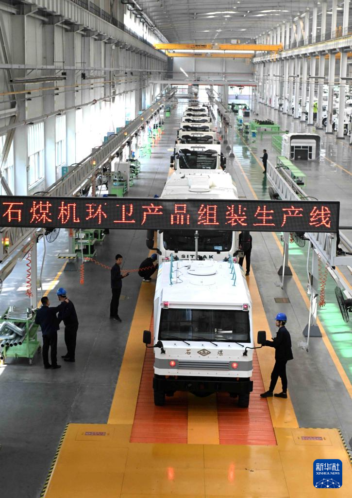 10月8日,在河北石家庄装备制造产业园,技术人员在石家庄煤矿机械有限公司调试新能源环卫车。
