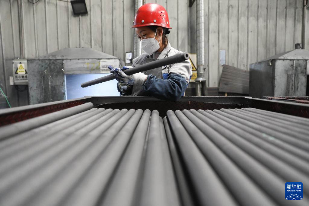 10月8日,在河南省平顶山市宝丰县高新技术产业开发区一家石墨制造企业,技术工人在检查石墨管材产品质量。