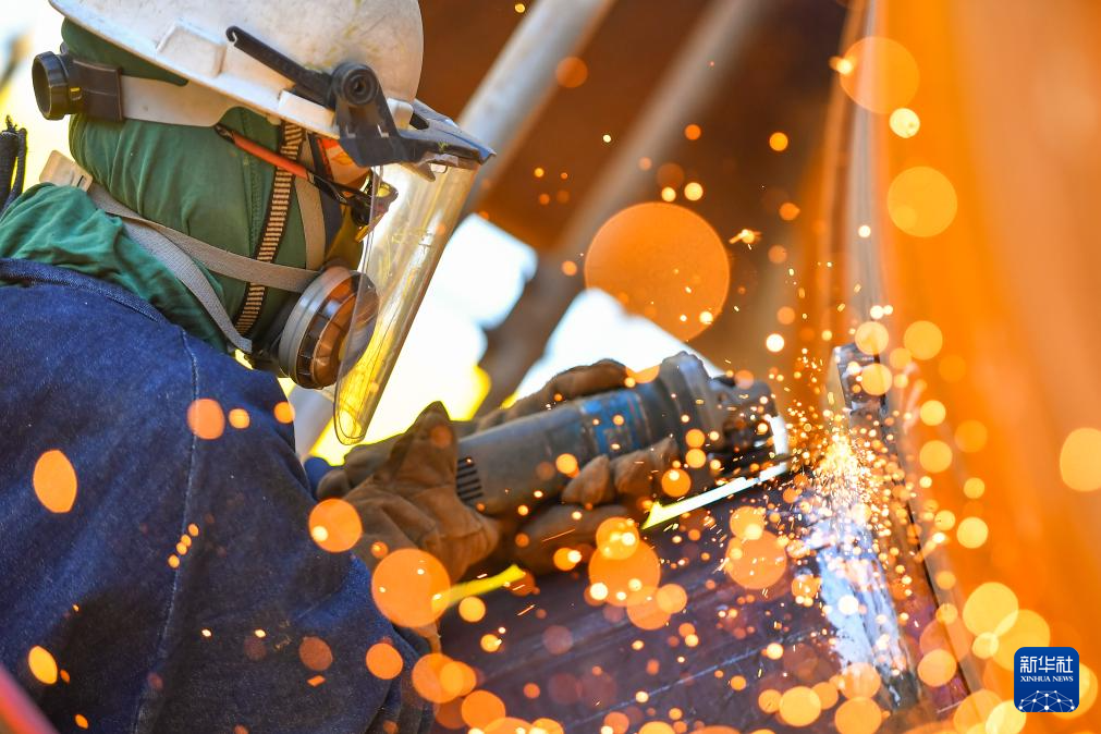 10月8日,工人在渤海油田海油工程天津塘沽建造场地施工。