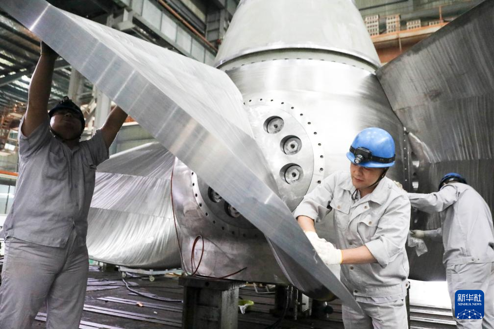 10月8日,在浙江省杭州市桐庐县富春江镇的一家水电设备制造企业,工人在车间内装配机组转轮。