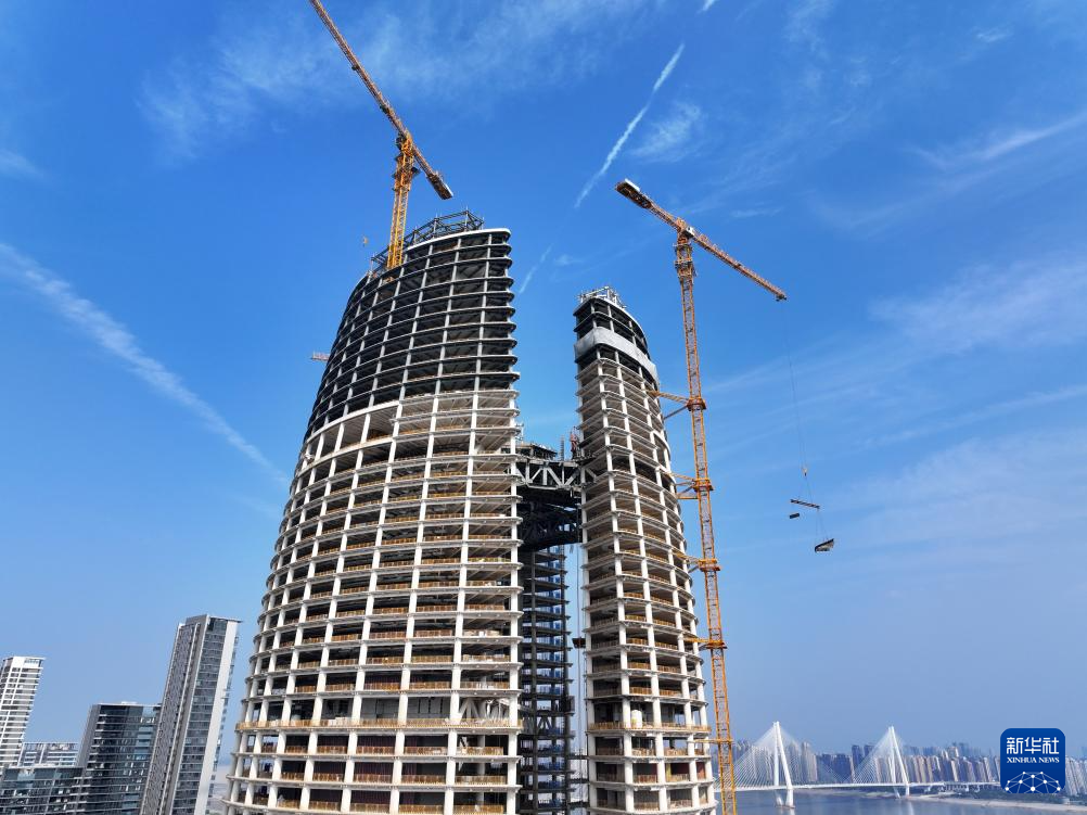 10月8日,在位于湖北省武汉市江岸区的泰康金融中心项目工地,施工人员进行吊装作业(无人机照片)。