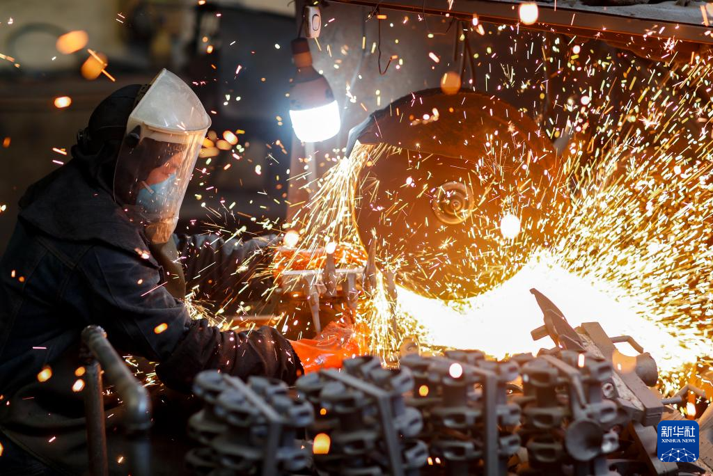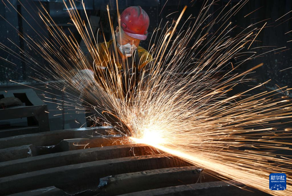 10月8日,在江苏省兴化市陈堡镇的泰州华丰精密铸造有限公司,工人在生产车间进行切割作业。