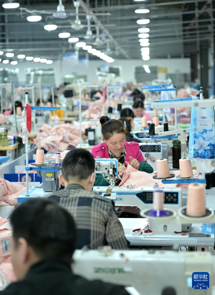 10月8日,湖北省宣恩县高罗镇一服装加工企业的车间里,工人在加工服装。