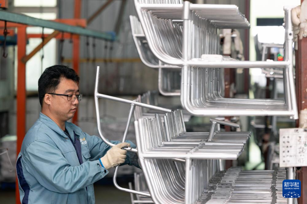 10月8日,在位于江苏省泰州市海陵区的一家医疗器材生产企业,工人在生产车间堆放轮椅车架。