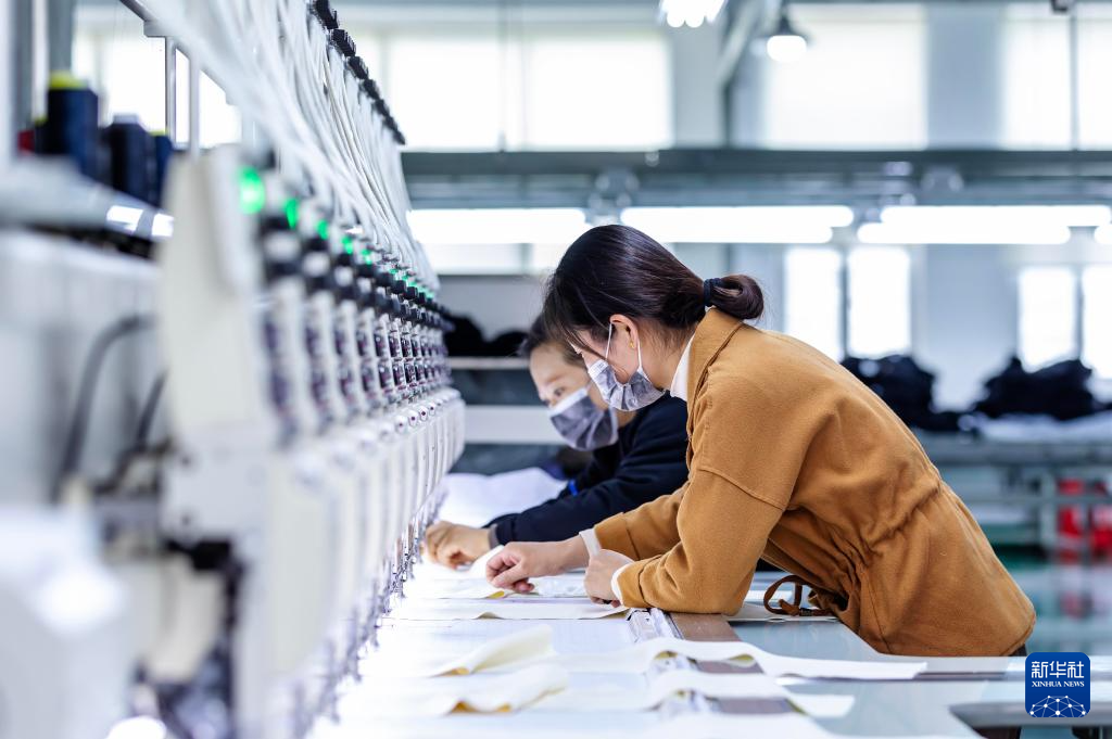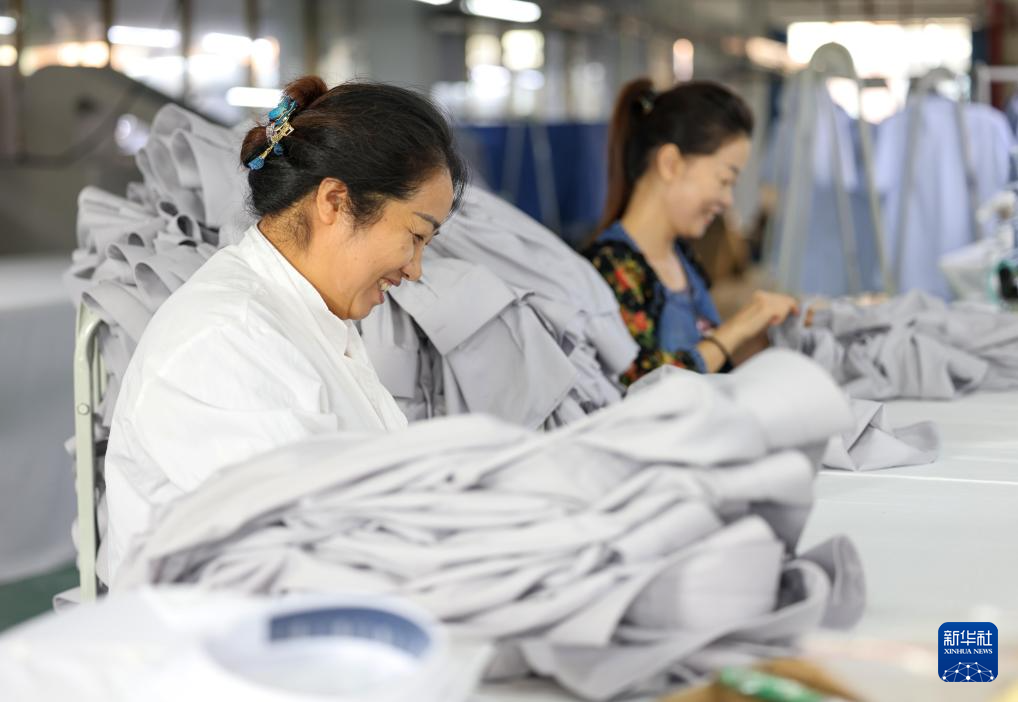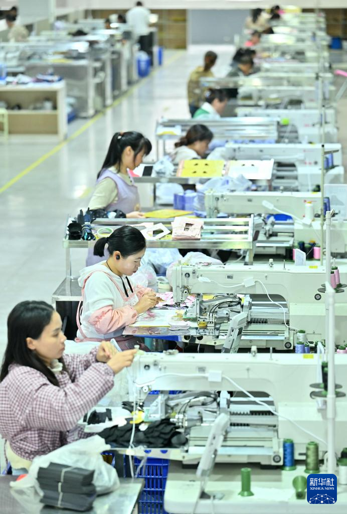 10月8日,工人在贵州省黔西市一家服饰公司生产车间加工服饰产品。