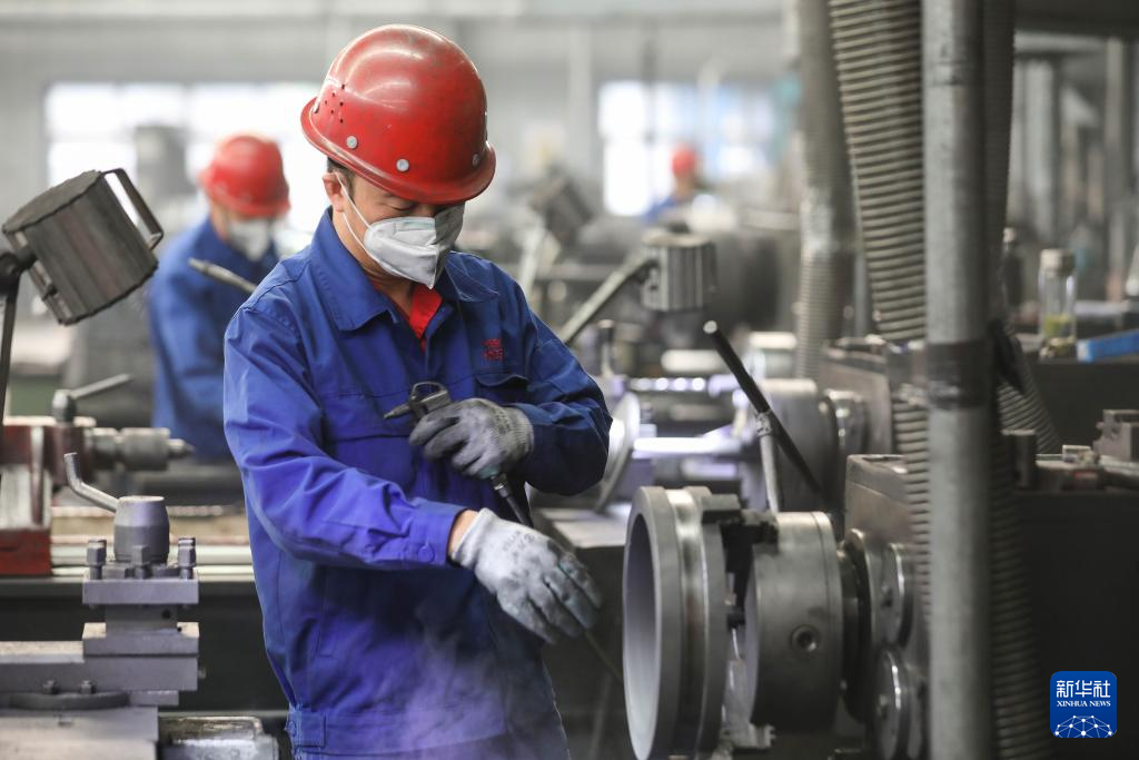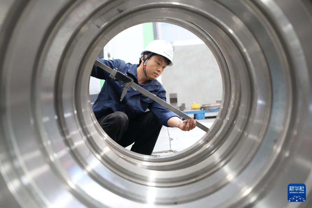 10月8日,在河南省焦作市温县经济开发区一家机械制造企业车间,一名工人在检查机械部件产品质量。
